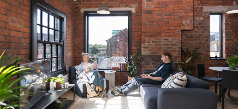 Flat share rooms at Eyewitness start from £950 per month, giving you a fully furnished or unfurnished bedroom in central Sheffield, plus access to shared spaces like luscious green courtyards, mini-cini, co-working spaces, concierge service, gym and more.