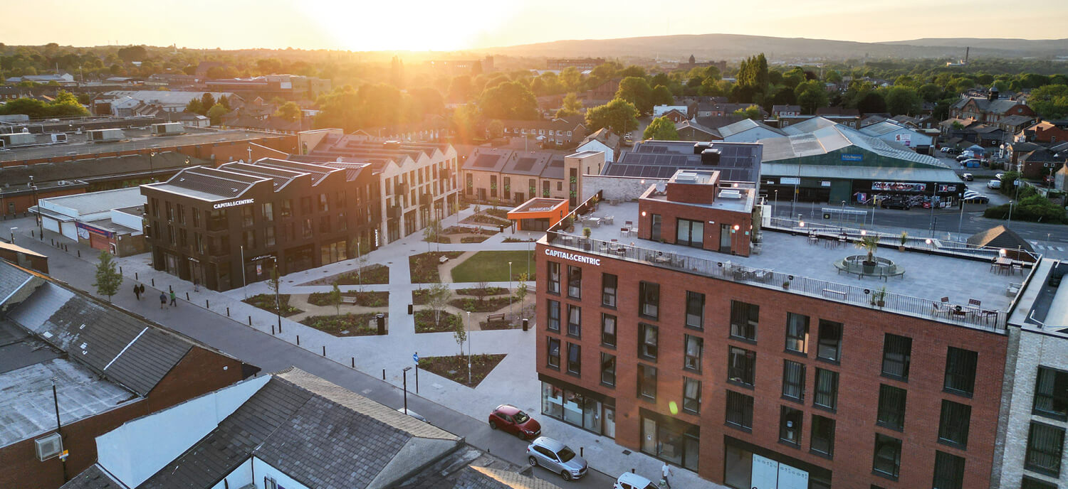 Farnworth Green is smack bang in the town centre, on the former market precinct site. It's nestled between the bus station and and high street, and less than 500m from the train station. It's just 5 mins to Bolton and 18 mins to Manchester on the train.